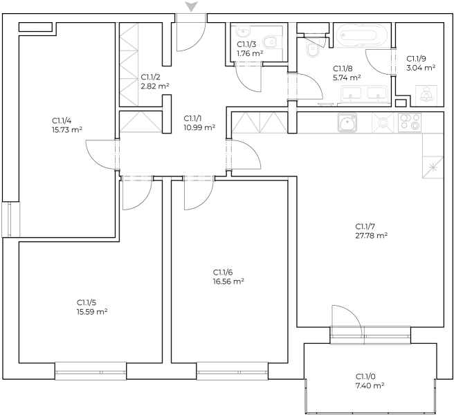 Plán půdorysu a plošné výměry jednotlivých místností jsou pouze orientační. Vyobrazená zařízení a vybavení (kuchyňská linka, elektrické spotřebiče, nábytek, atd) nejsou součástí dodávky. Přesný rozsah dodávky standardu a ploch je specifikován ve smlouvě. Developer si vyhrazuje právo na změnu standardu. Veškeré údaje v tomto schématu mají pouze informativní charakter a mohou se lišit od skutečnosti.