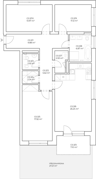 Plán půdorysu a plošné výměry jednotlivých místností jsou pouze orientační. Vyobrazená zařízení a vybavení (kuchyňská linka, elektrické spotřebiče, nábytek, atd) nejsou součástí dodávky. Přesný rozsah dodávky standardu a ploch je specifikován ve smlouvě. Developer si vyhrazuje právo na změnu standardu. Veškeré údaje v tomto schématu mají pouze informativní charakter a mohou se lišit od skutečnosti.