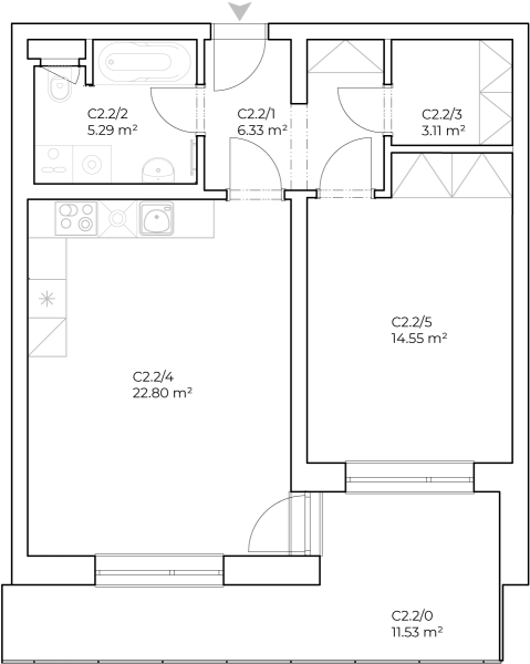Plán půdorysu a plošné výměry jednotlivých místností jsou pouze orientační. Vyobrazená zařízení a vybavení (kuchyňská linka, elektrické spotřebiče, nábytek, atd) nejsou součástí dodávky. Přesný rozsah dodávky standardu a ploch je specifikován ve smlouvě. Developer si vyhrazuje právo na změnu standardu. Veškeré údaje v tomto schématu mají pouze informativní charakter a mohou se lišit od skutečnosti.