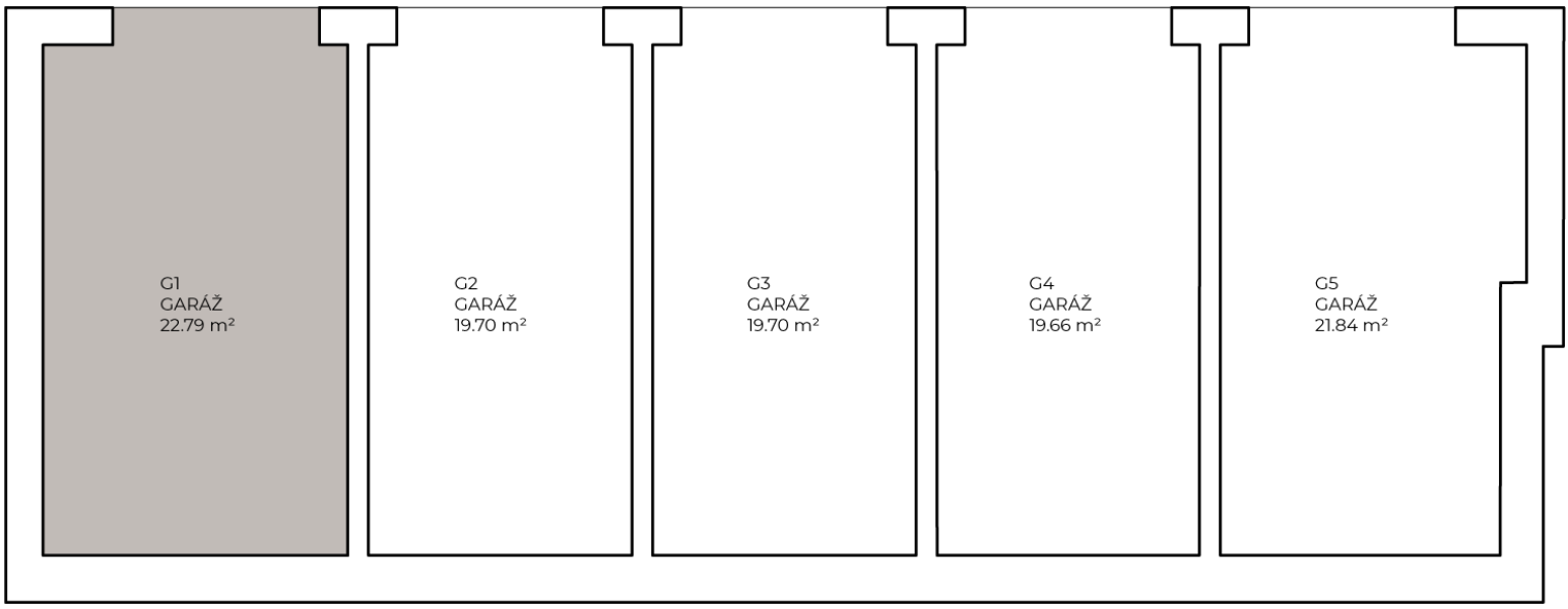 Plán půdorysu a plošné výměry jednotlivých garáží jsou pouze orientační. Přesný rozsah dodávky standardu a ploch je specifikován ve smlouvě. Developer si vyhrazuje právo na změnu standardu. Veškeré údaje v tomto schématu mají pouze informativní charakter a mohou se lišit od skutečnosti.
